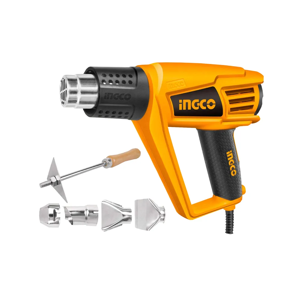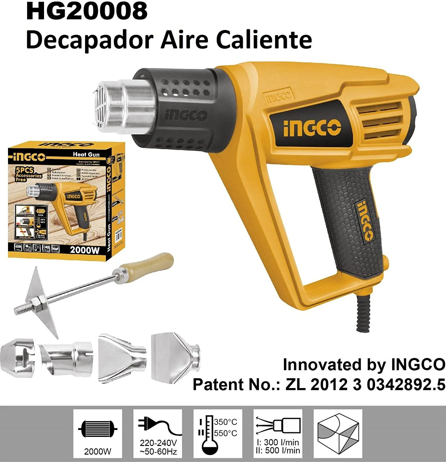 Tension : 220V-240V~50/60Hz Puissance d'entrée : 2000WTempérature : 350 °C/550 °C Débit d'air : 300/500 L/min Avec 1 grattoir et 4 buses. Emballé par boîte de couleur.